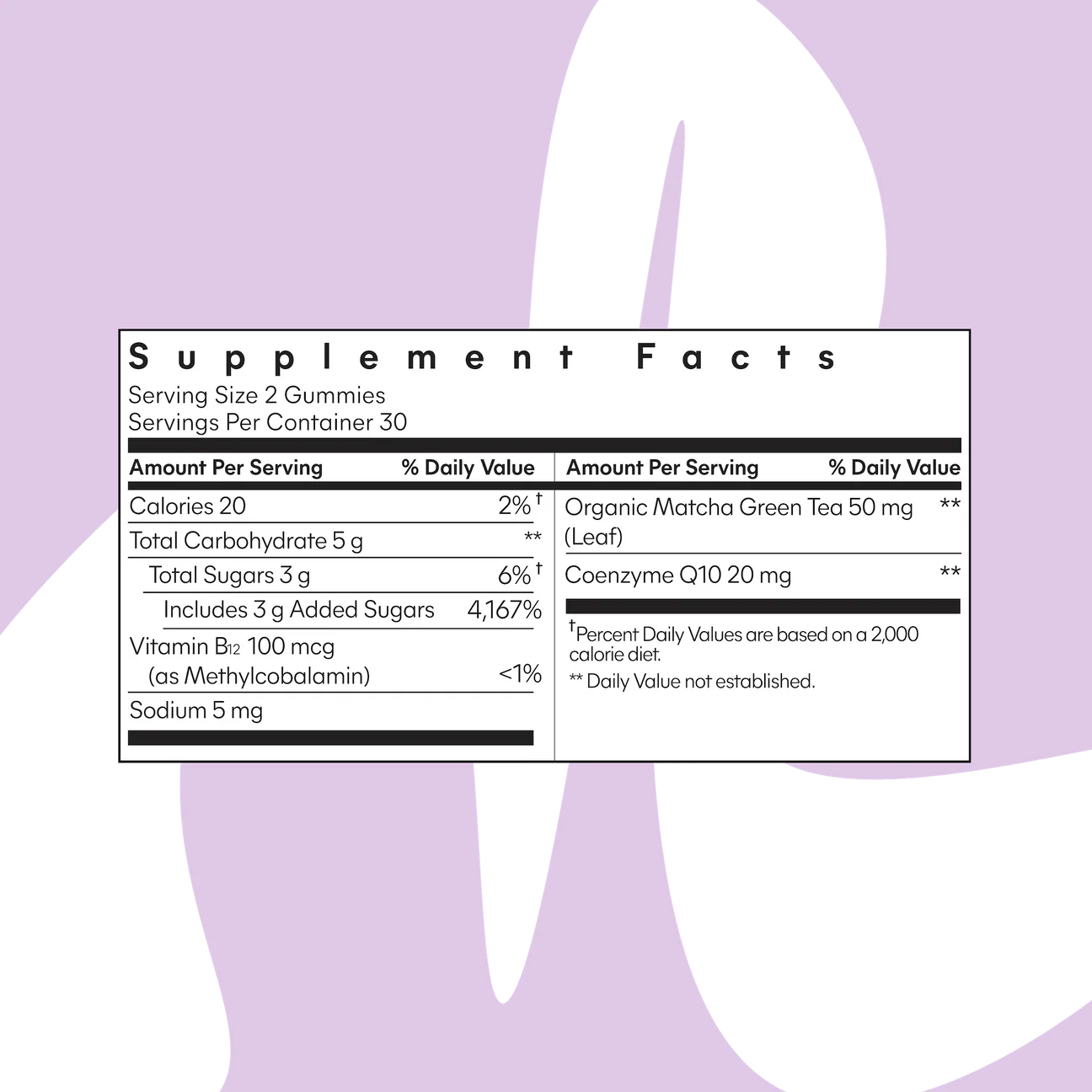 Estas gomitas combinan los beneficios del Matcha orgánico, la Vitamina B12 y el CoQ10, apoyando la producción de energía y el metabolismo a nivel celular, sin picos ni jitters. Energía limpia para acompañarte todo el día.*