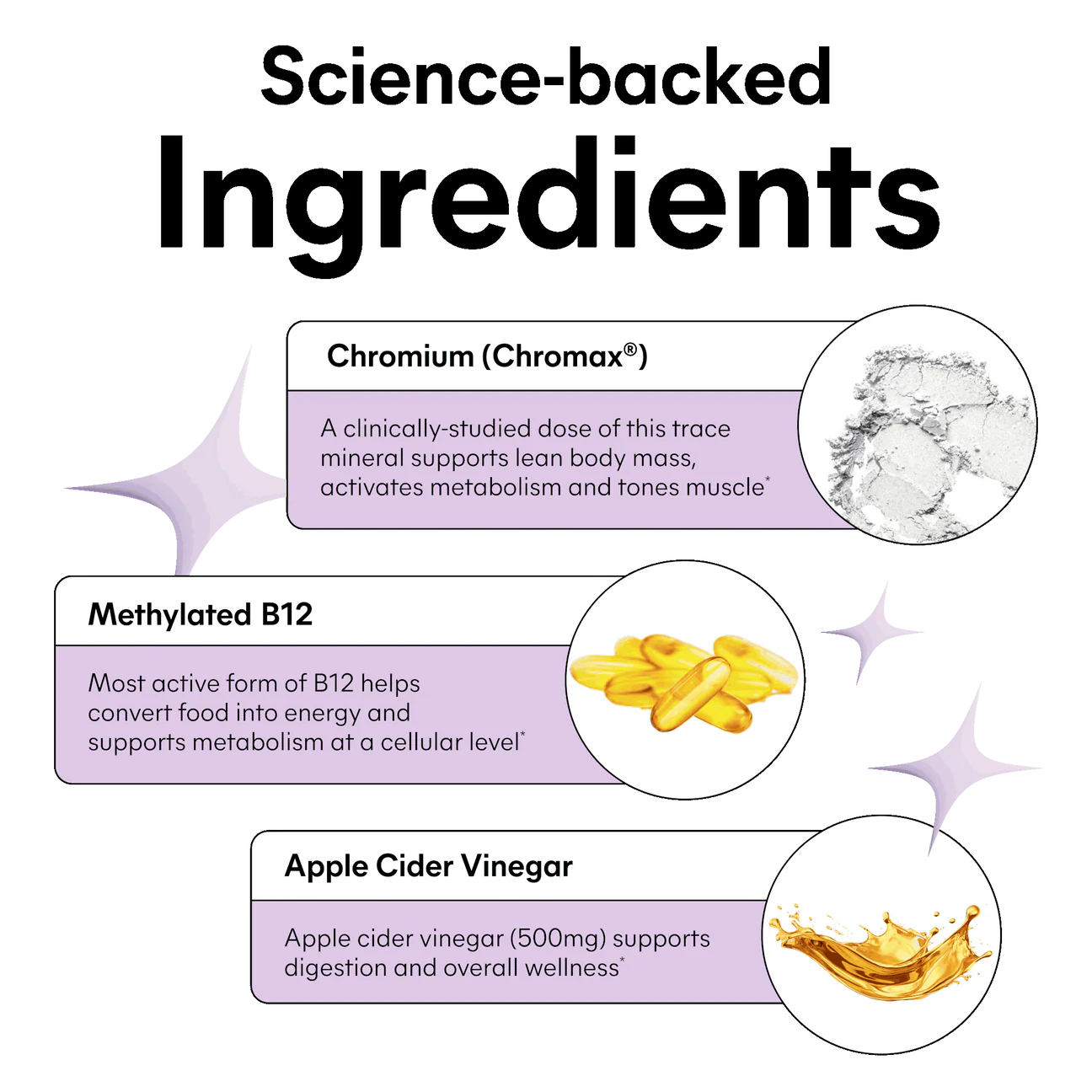 Estas gomitas están formuladas con Chromax® clínicamente estudiado, que ayuda a apoyar la masa corporal magra y promover una composición corporal saludable, mientras que el Apple Cider Vinegar y la Vitamina B12 metiladaimpulsan tu metabolismo y acompañan tus objetivos fitness.*