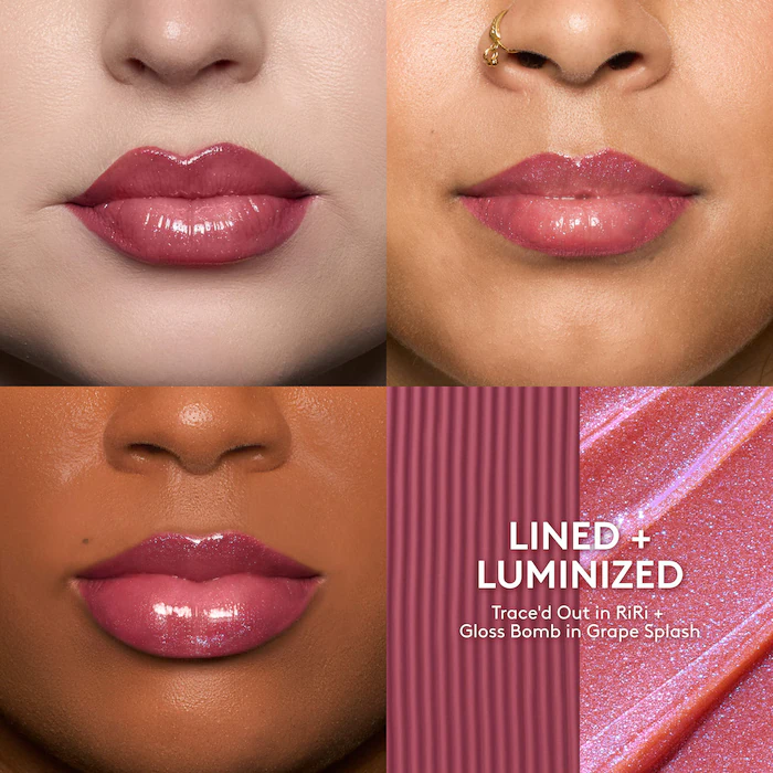 El Trace’d Out Lip Liner viene en el tono más vendido Riri (un rosa malva favorecedor), mientras que el Gloss Bombllega en el nuevo tono Grape Splash, un morado holográfico que aporta brillo multidimensional y vibra festiva 🍇💫